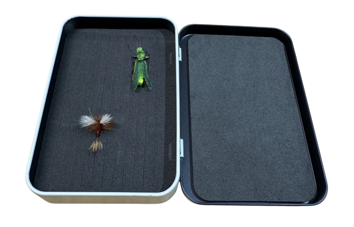 This slim tin fly box has foam sections for holding flies securely and foam for additional fly placement.